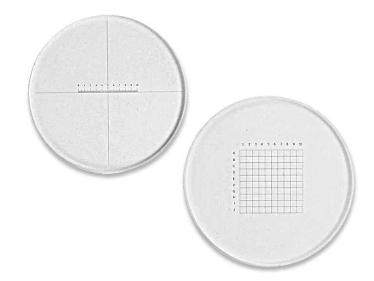 Strichplatten/Reticles für MessokulareMess- und Zählhilfe im Okular Variantenreiche Muster und Skalen Vergrößerungsabhängige KalibrierungPositionierung bzw. Einbau im Okular