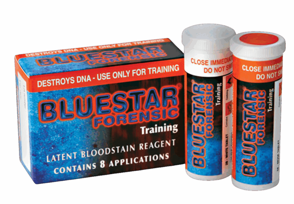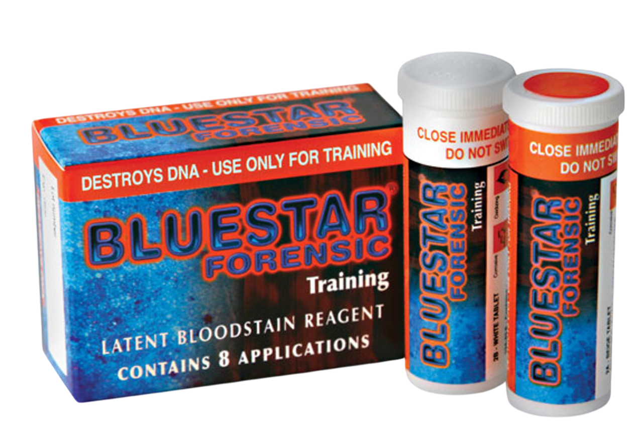Bluestar® Forensic Training-Tabletten sind speziell für Schulungs- und Trainingszwecke vorgesehen und kein Einsatzprodukt im forensischen Realfall. Die spezielle Zusammensetzung zerstört oder verändert die DNA der Blutspur, wodurch diese Version günstiger ist und ideal für Ausbildungszwecke geeignet ist. Je nach Packungsgröße (4 oder 8 Paare) lassen sich mehrere Lösungseinheiten herstellen. Die Reaktion auf Blut erfolgt analog zur echten Bluestar® Forensic Lösung, mit starker und lang anhaltender Lumineszenz – jedoch ohne Eignung zur nachfolgenden DNA-Analyse. Auch stark verdünnte Blutspuren (bis ca. 1 : 10 000) können sichtbar gemacht werden. Eine vollständige Dunkelheit ist nicht zwingend notwendig, und mit etwas Übung lassen sich echte Reaktionen von falsch-positiven Ergebnissen anhand von Farbe, Helligkeit und Dauer unterscheiden.