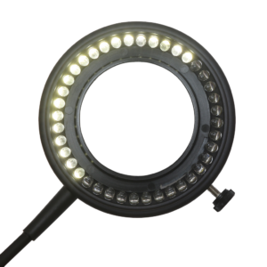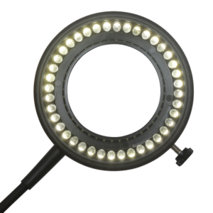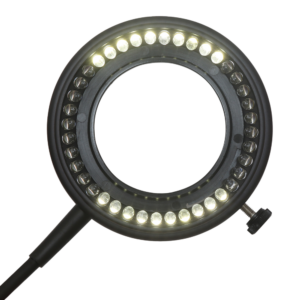 Das LED Ringlicht 40 von Photonic kombiniert helle und homogene Ausleuchtung durch 40 LEDs mit segmentierbarer Steuerung für Voll-, Halb- oder Viertelkreis. Es ist schlank gebaut (Außendurchmesser ca. 94 mm), passt standardmäßig auf Ø 66 mm Objektive und lässt sich mit verschiedenen Adaptern auch an andere Mikroskope anbringen. Der Arbeitsabstand liegt zwischen 55 mm und 120 mm, bei ca. 5000 K Farbtemperatur – ideal für präzise und flexible Anwendungen unter verschiedenen Mikroskopbedingungen.