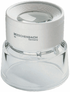 Standlupen von Eschenbach mit asphärischen oder aplanatischen Leichtlinsen, verschiedenen Vergrößerungen und offenem Stand für freies Arbeiten unter der Linse.